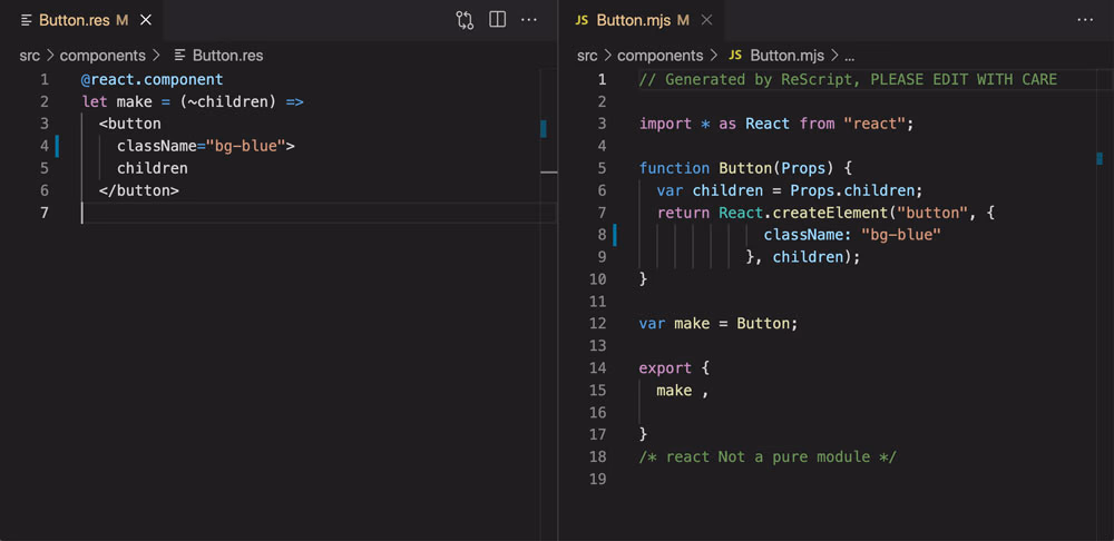 ReScript is a strongly typed language that compiles to clean, efficient JavaScript that humans and AI tools can read and understand.